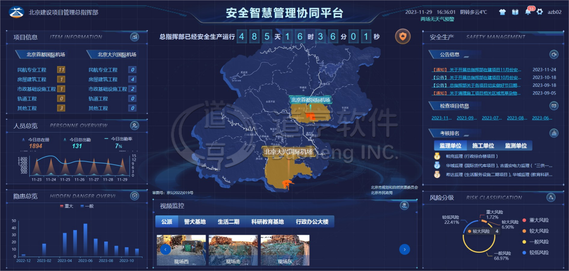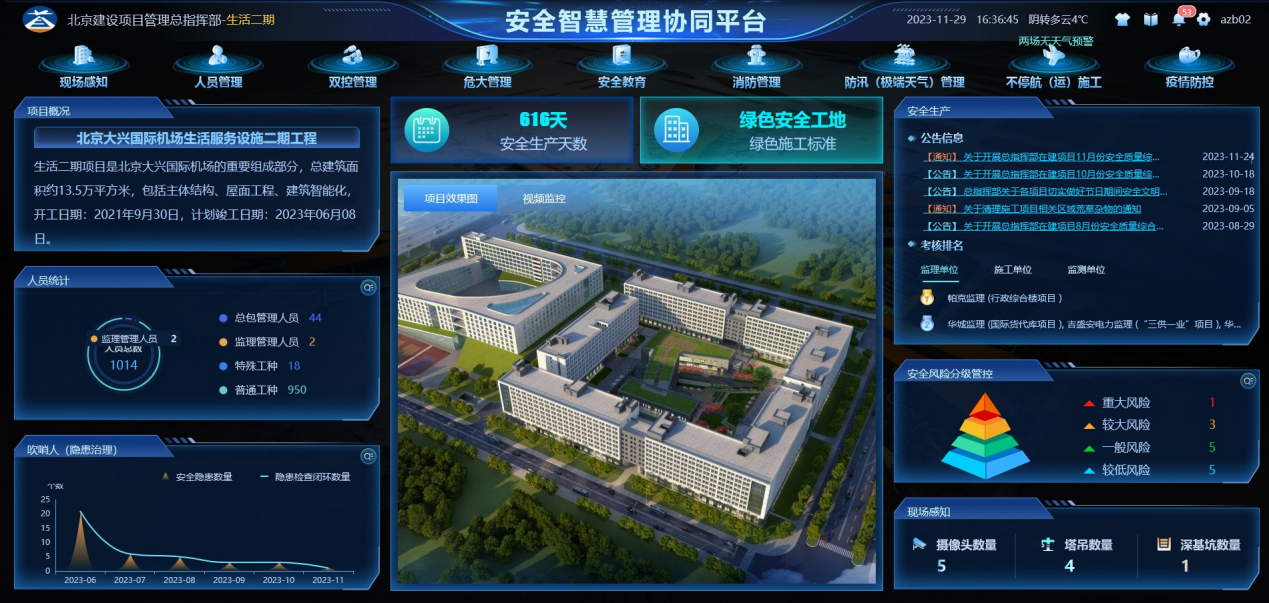 安全智慧管理协同平台以Web、APP、小程序、大屏展示等多种方式应用,支持工程安全生产各级管理单位及参建方对现场的实时监管,分级监管,协同监管,帮助监管部门进一步落实安全生产主体责任,充分保障不停航施工期间首都机场运营安全顺畅,以数字技术持续提升建设工程安全生产监督管控水平,打造具有行业引领价值的民航机场“不停航施工安全生产”标杆项目。