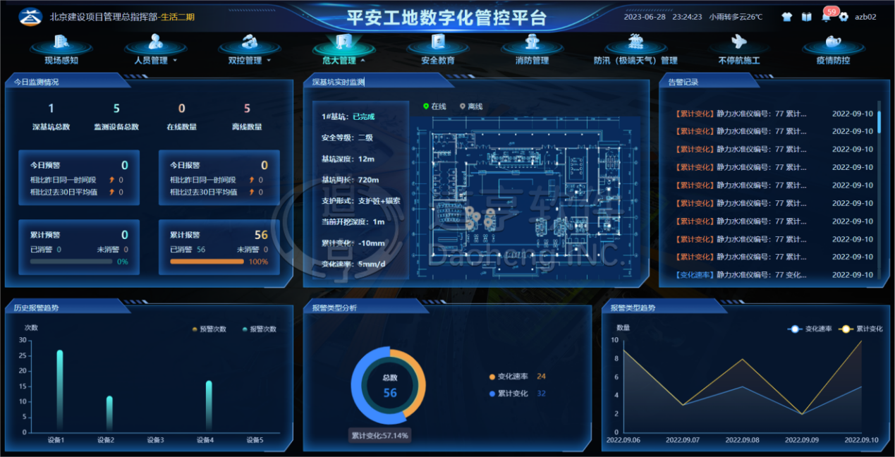平台提供深基坑、高支模、塔吊、脚手架、升降机、卸料平台、吊篮等大型工程器械的智能监测功能,可广泛应用于斜坡施工区、高支模施工区、配电区、人员密集区、危险品区、地下施工区、相对封闭区、电焊作业区、特殊作业区、高处临边洞口区等施工场景,实现24小时实时监测、报表推送、多重分级预警、应急预案处理、结构趋势分析、历史资料存储,提高危大工程管理的便捷性和准确性,为建设施工管理提供安全保障。