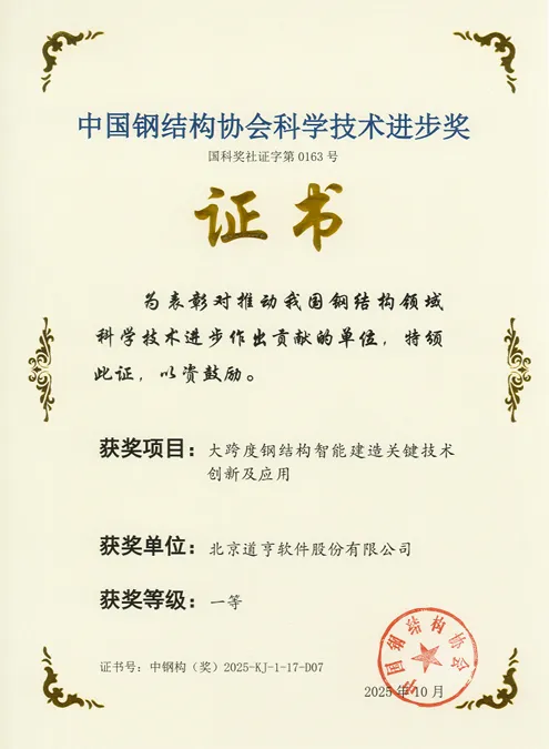 近日,中国钢结构协会第九届会员代表大会暨2025中国钢结构大会在广西南宁召开,大会现场颁发了2025年度中国钢结构协会科学技术进步奖。由北京道亨软件股份有限公司参与完成的“大跨度钢结构智能建造关键技术创新及应用”项目,获得2025年度中国钢结构协会科学技术进步奖一等奖。